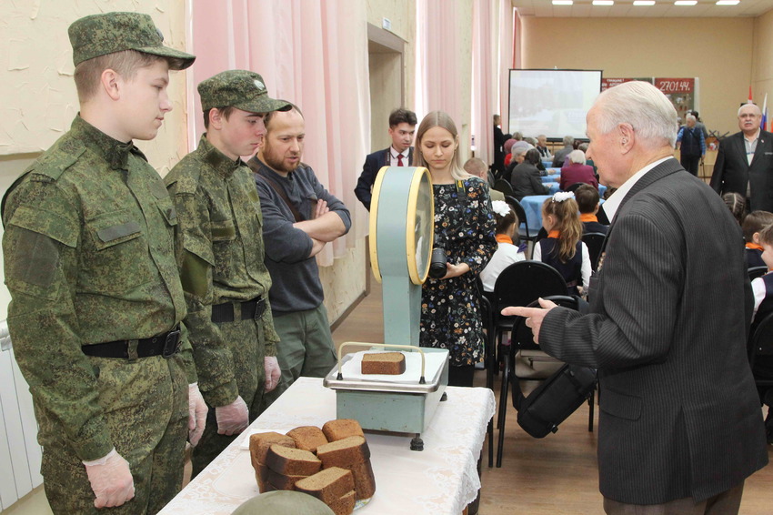 Каждого почетного гостя встречали учащиеся кадетского корпуса войск национальной гвардии РФ, волонтеры Центра молодежной политики. В зале тематические выставки. Экспозиция «Блокадная пайка». Весы. На товарной площадке весов - символ надежды и жизни ленинградцев ― 125 граммов коричнево-черного цвета краюшка хлеба, наглядно демонстрирующая минимальную дневную норму пайки хлеба, предназначавшейся для жителей блокадного Ленинграда.