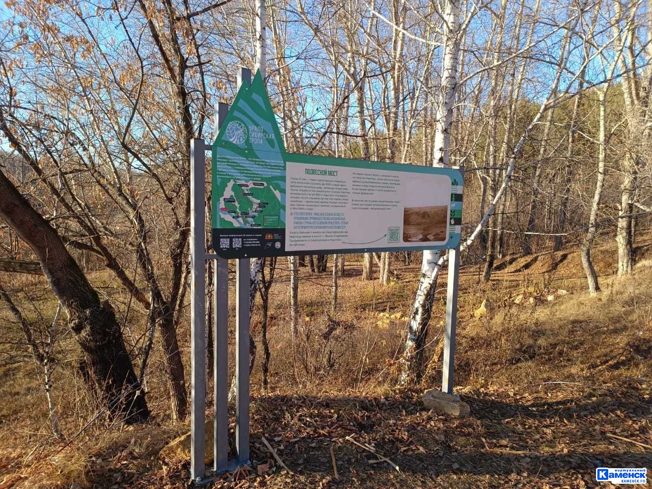 Информационные стенды уже установлены в нескольких точках: на месте старта, на территории, где ранее производилась выработка руды, на локациях, откуда открывается вид на Майскую поляну и на скалу Три брата, у выхода из ущелья, где когда-то работала штольня, у слияния Каменки и Исети и у висячего моста, где была паромная переправа.