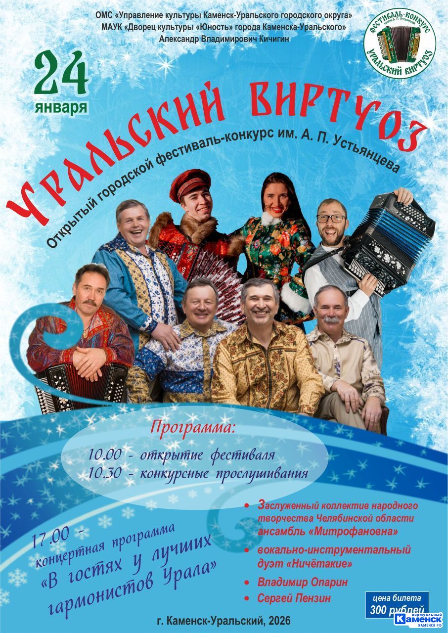 24−25 января в ДК «Юность» впервые пройдёт фестиваль «Уральский Виртуоз», посвящённый памяти выдающегося каменского гармониста Александра Петровича Устьянцева.