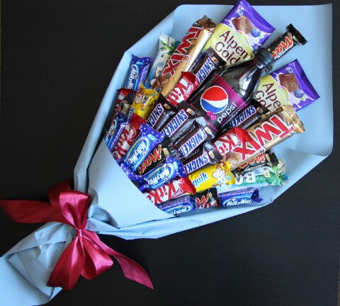 - В мае у младшего брата моего мужа день рождения, так как мы никогда не дарим банальные подарки, я решила за неделю до этого дня смастерить торт из конфет. Результат мне понравился и я решила этим поделиться у себя в своей группе (в социальной сети). Какого было моё удивление, когда в этот же день у меня захотели его купить, так как был запас во времени я согласилась на сделку. После этого тортика решила попробовать собрать букет из шоколадных батончиков и снова выложила в свою группу.