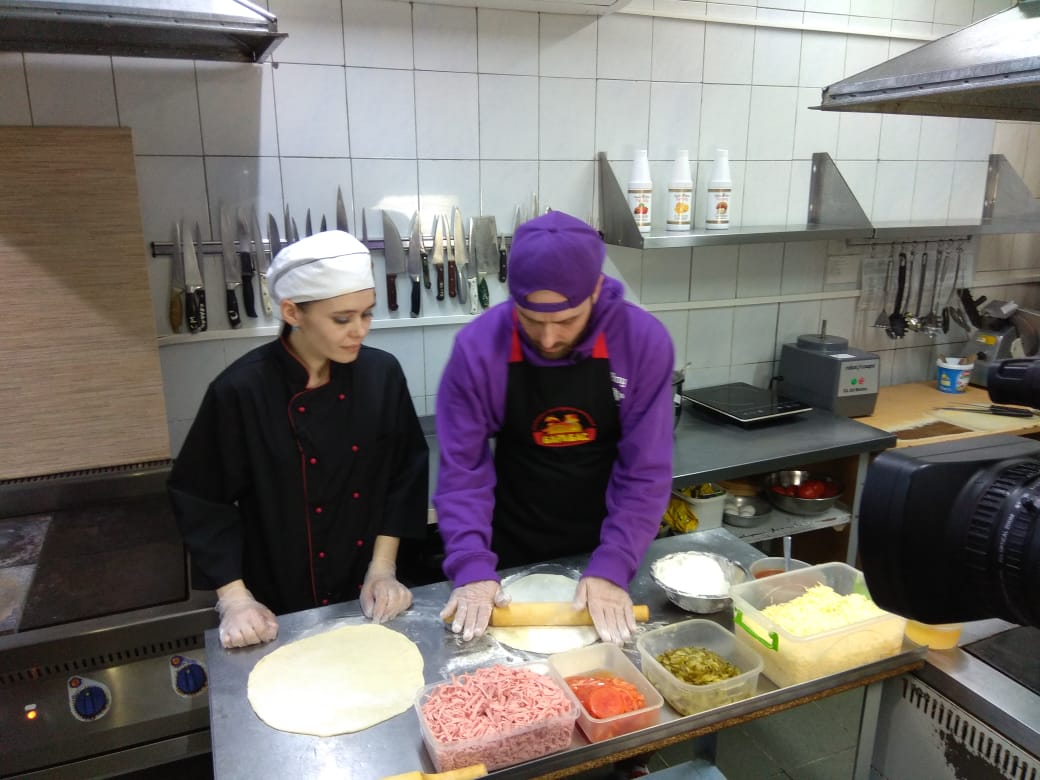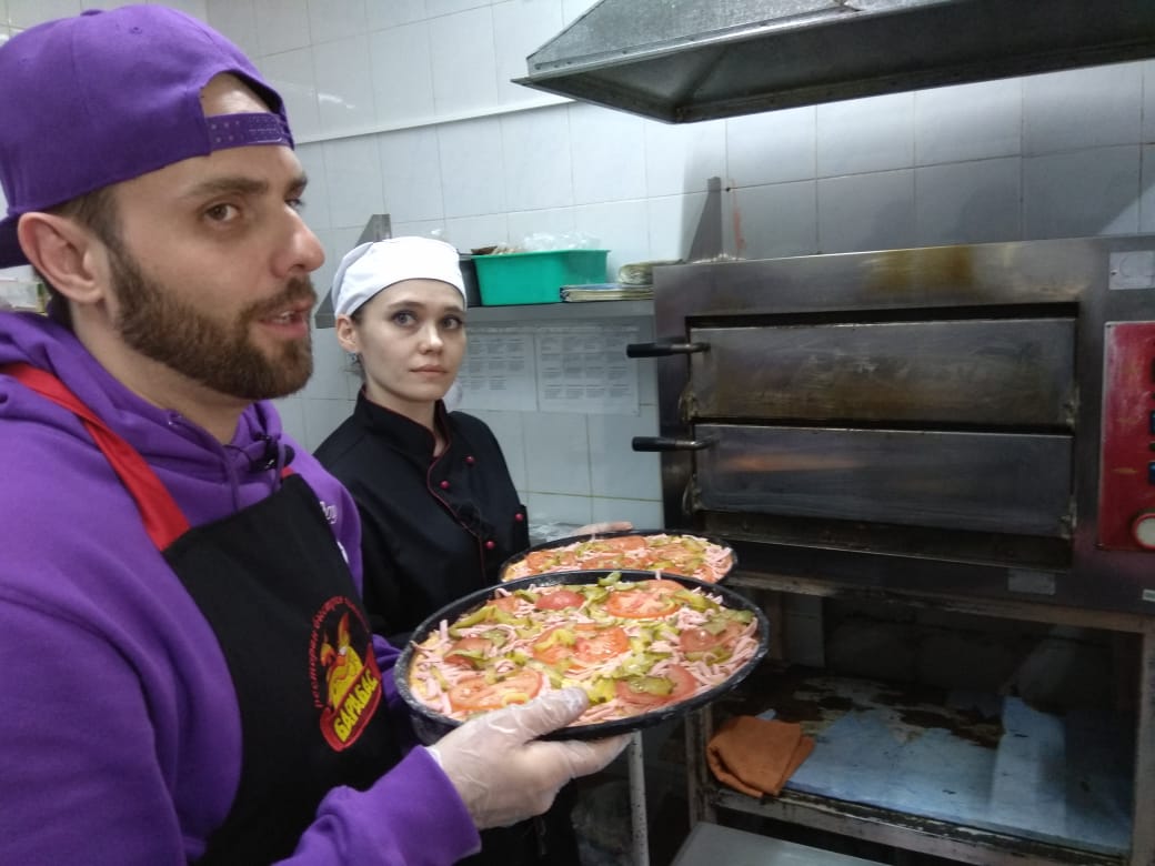 Я спрашиваю о случаях, когда пиццу, люди, даже под руководством повара, портили. Получаю ответ, что это нереально, что ж будем верить в меня. Настроился, готов, руки чешутся, спешу в бой, но, оказывается не по форме одет, перчатки забыл, фартук тоже, исправляю ситуацию, все на своих местах.
