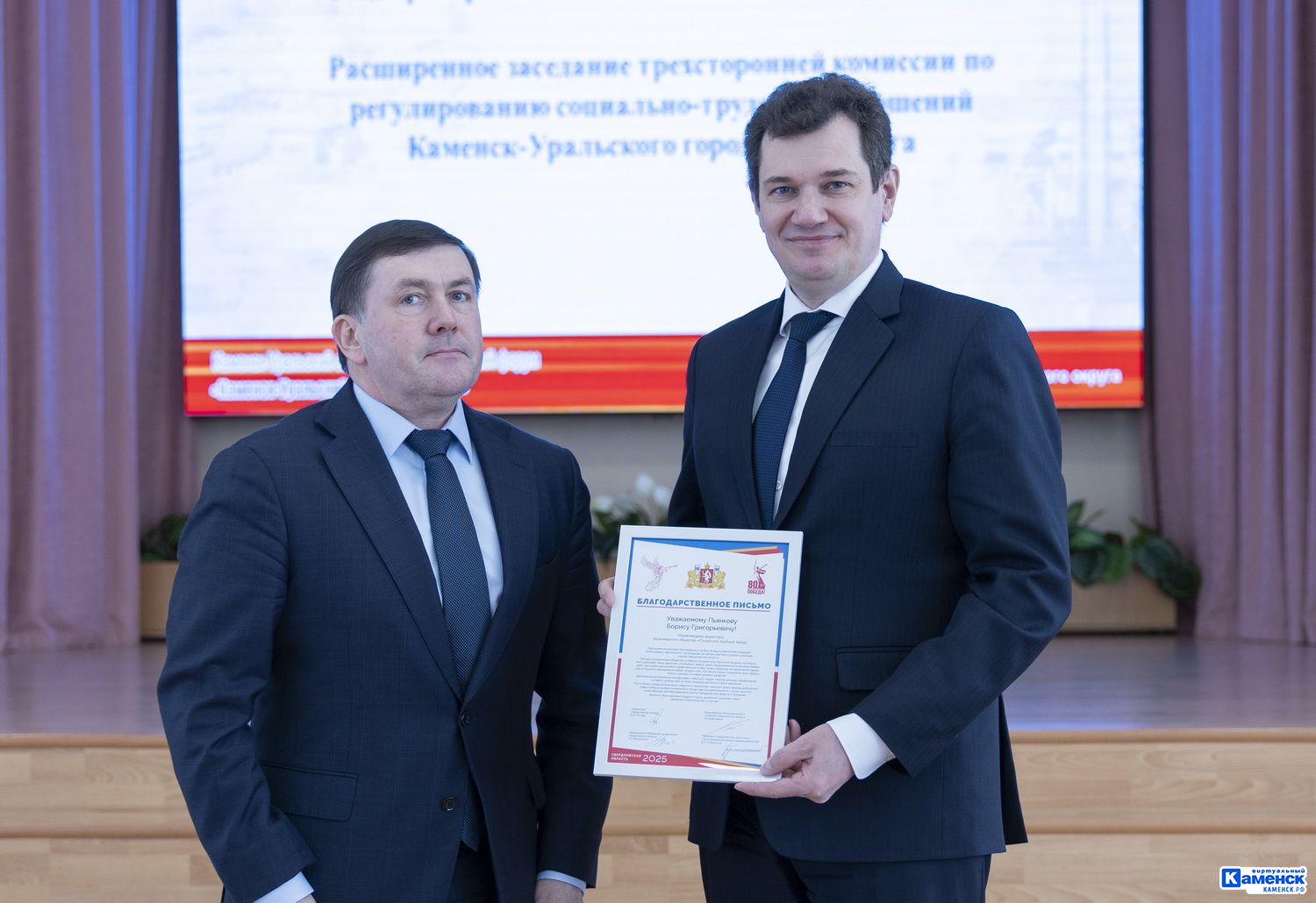 В рамках городского гражданского форума Каменск-Уральского городского округа первый заместитель губернатора Свердловской области, министр промышленности и науки Свердловской области Алексей Шмыков вручил благодарственное письмо за подписью губернатора Свердловской области Дениса Паслера управляющему директору СинТЗ Борису Пьянкову за благотворительную деятельность.