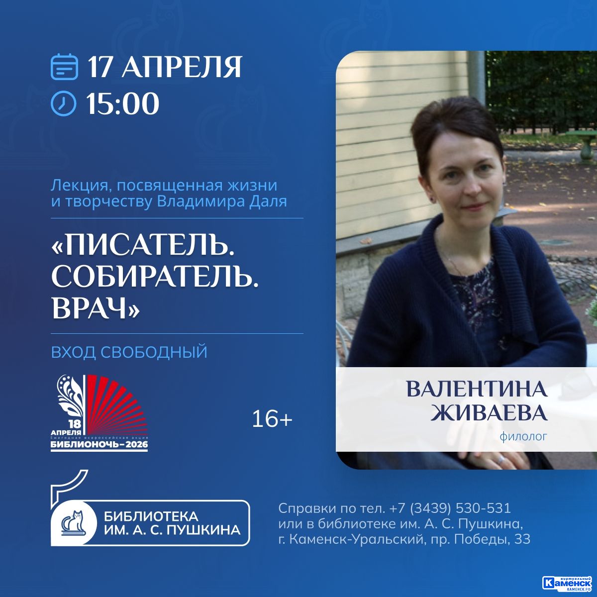 15−00 — лекция Валентины Живаевой «Писатель. Собиратель. Врач» о жизни и творчестве Владимира Даля 16+