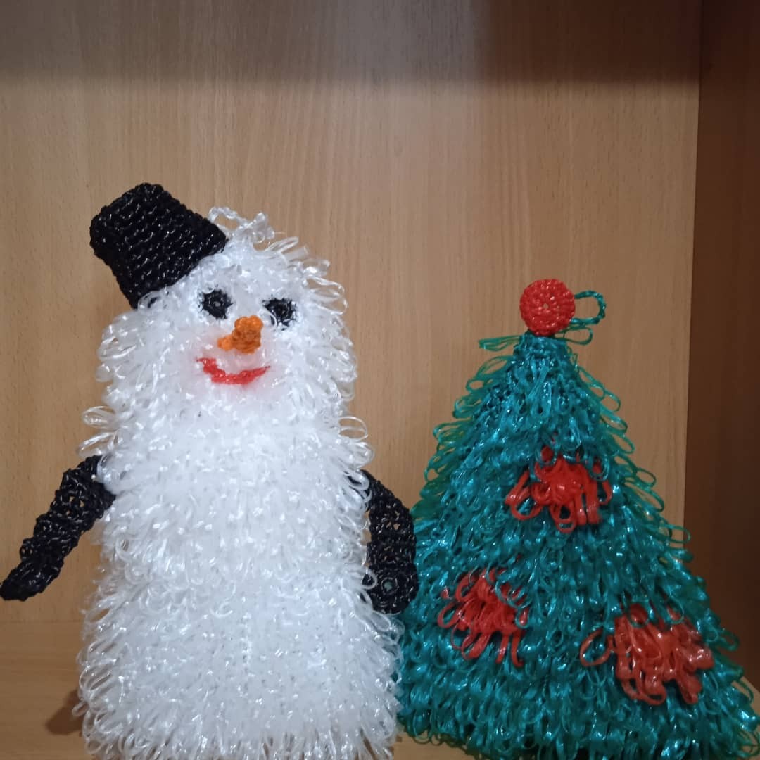— Первая работа из бисера — малюсенькое деревце, а первая игрушка-мочалка — совушка.