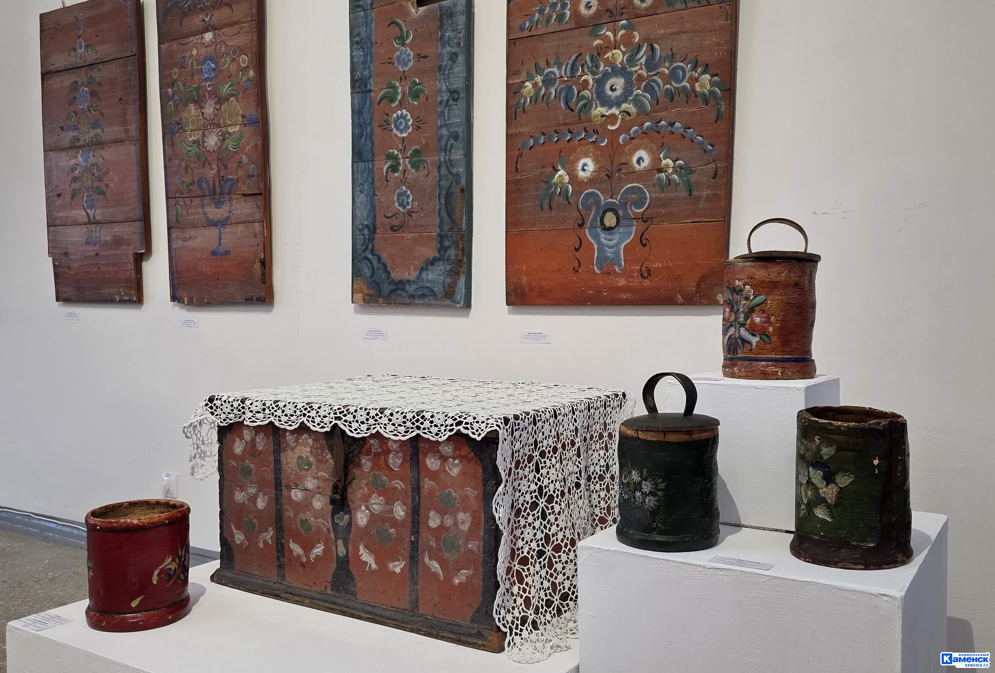 Особое место в коллекции занял простенок стены горницы. Удивительной красоты уральская роспись разливается на светло выкрашенном дереве. Белая основа невероятно выделяет цветочный орнамент и делает его особенным. Другие элементы интерьера не менее интересно расписаны: сундуки, туеса, прялки и другие экспонаты выставки.